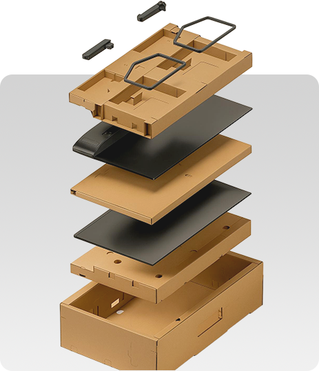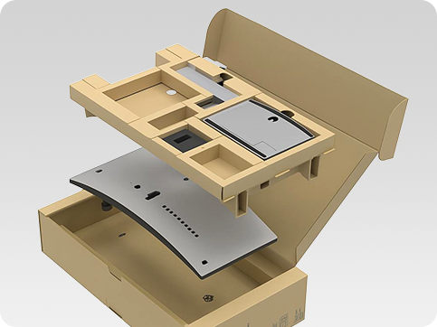 大尺寸曲面屏显示器采用全纸卡包装方案,外盒为便于拿取的披萨盒设计,下托借助纸板可弯曲性,贴合曲面屏制作弧形支撑垫保护屏幕上托纸卡用于放置配件;包材选用瓦楞纸板尺寸952x485x226mm,已通过6角3棱6面760mm高跌落测试,实现全面保护、安全及全纸卡的特点,适配产品形态与运输防护需求。