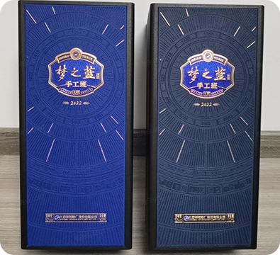 梦之蓝手工班(大师)礼盒升级方案,紧扣产品 “三老两多一少” 特质(明清老窖池、纯手工工艺、30年以上地下酒窖存储等),在原梦 9 盒型基础上,优化为四棱角倒圆边露腰箱式盒,以黑色乌木纹纸搭配蓝色沙粒纹PU皮,辅以丝印紫光防伪、烫金等工艺。外圆内方的结构设计,既体现 “天地同酿,艺人合一” 的手工理念,又通过可降解中纤板等材料,传递稀缺尊贵的品质与环保责任,实现文化内涵与现代工艺的融合。
